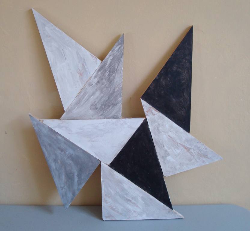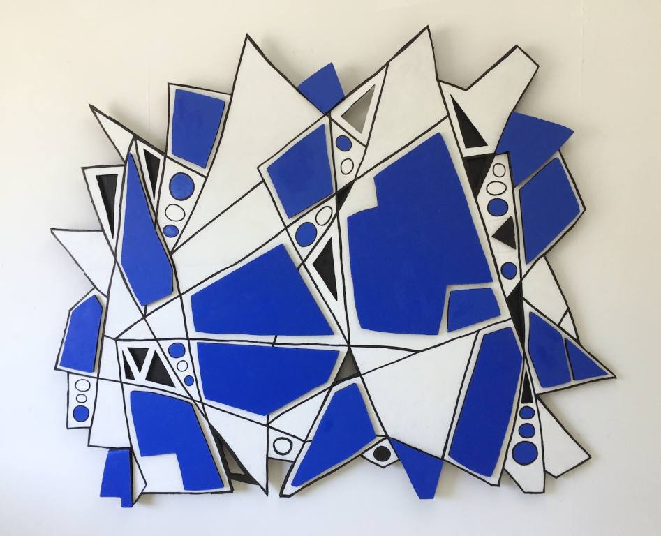The large wall-hanging sculpture at right, approx 5' x 4', is made from layers of thick recycled cardboard.