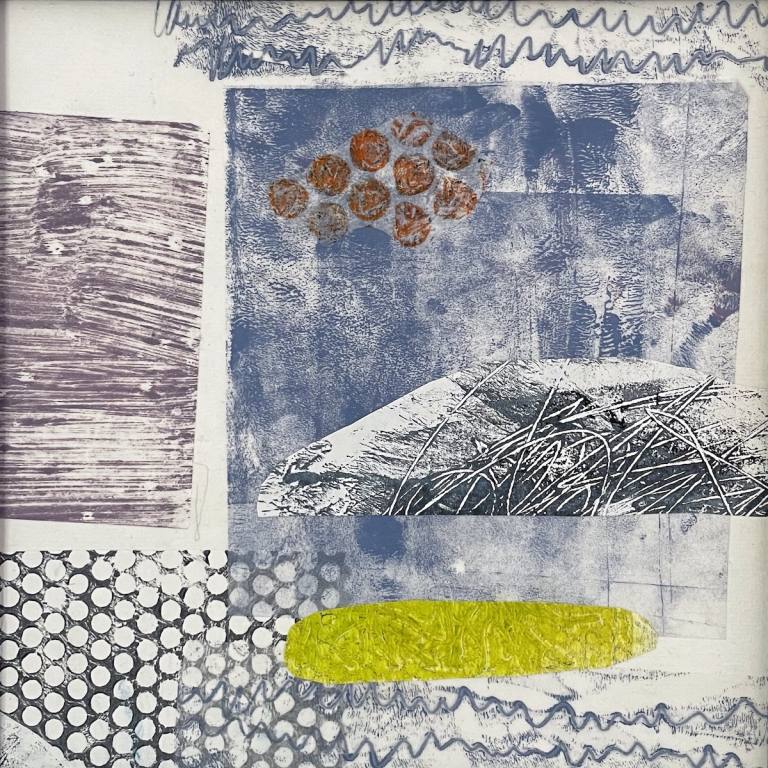 The piece at right and the one below are examples of the collages I make with the printed papers I create in my studio. Both of these compositions are 8" square and are mounted on canvas board.